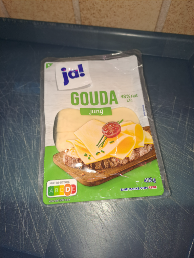 Ja! is a private label brand owned by the Edeka Group, a prominent grocery retailer in Germany. The brand is known for offering a wide range of products, including dairy items like Gouda cheese. The Gouda cheese depicted in the image is a type with 48% fat content and is typically marketed as young Gouda. Edeka sources many of its products from various manufacturers across Europe, thus the label indicates production in multiple countries. The brand aims to provide quality food products at competitive prices, embodying the values of reliability and affordability.