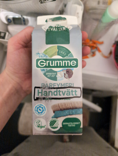 Grumme Handtvätt Parfymfri is a liquid hand wash detergent designed for delicate fabrics such as wool, silk, fleece, microfiber, knitwear, linen, and down garments. Manufactured primarily in Norway, this product is also produced in other locations. The brand Grumme originates from Sweden and is owned by Grumme AB. The ultimate owner of the Grumme brand is Orkla ASA, a Norwegian multinational corporation specializing in branded consumer goods and services, including food, personal care, and cleaning products. The product is dermatologically tested, fragrance-free, and certified by the Asthma and Allergy Association, making it suitable for individuals with sensitive skin. Additionally, it is vegan-certified by the Vegan Society and environmentally certified by the Swan label, reflecting its commitment to sustainability. The detergent is packaged in a practical cardboard container, emphasizing its eco-friendly design.