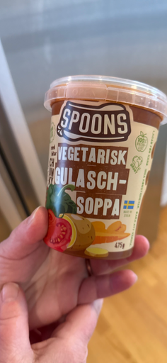 Spoons is a Swedish brand known for its vegetarian meals, particularly soups. The 'Vegetarisk Gulaschsoppa' is a vegetarian version of the traditional goulash soup, reflecting the brand's commitment to providing plant-based alternatives. The product is likely manufactured in multiple countries to ensure availability and meet demand in Sweden and beyond. As part of the growing trend towards vegetarianism, Spoons aims to make healthy eating accessible and convenient.