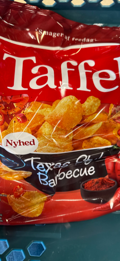 Taffel is a well-known Danish brand famous for its variety of snack products, particularly chips. Originating in Denmark, Taffel has made its mark in the snack industry with flavors that cater to local tastes. The brand has expanded its presence in the market under the ownership of Intersnack Group, a leading European company in the savory snack sector, primarily based in Germany. The product packaging highlights the flavor 'Texas BBQ', indicating a focus on bold and robust taste profiles appealing to the Danish consumer. Taffel chips are manufactured in multiple countries, ensuring a wide distribution and availability in various markets.