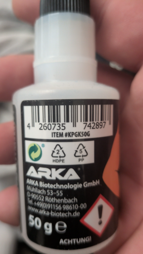 ARKA Biotechnologie GmbH is a German company that specializes in biotechnology solutions, particularly in developing adhesive products. This adhesive is marketed under the brand name ARKA and is produced in Rothenbach, Germany. The product comes in a 50 g bottle and is used in various applications requiring strong bonding solutions, ensuring high-quality performance due to its specialized formulation.