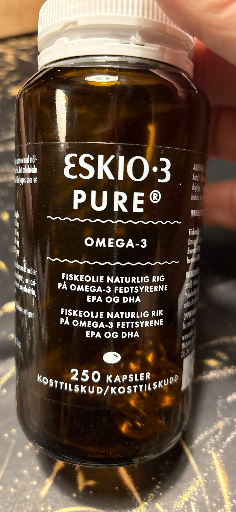 ESKIO-3 Pure Omega-3 Flydende is a fish oil supplement rich in omega-3 fatty acids EPA and DHA, which contribute to normal heart function. The fish oil used in this product is certified by Friend of the Sea, an international certification for sustainable fishing. The product is manufactured primarily in Norway, with other production locations as well. The brand ESKIO-3 originates from Norway and is produced by Eskio-3 AS. The ultimate owner of the brand is Midsona AB, a Swedish company specializing in health and wellness products. There are no known subsidiaries owning the brand locally.