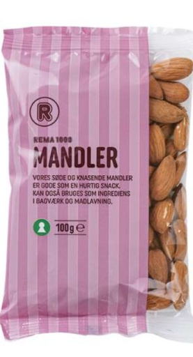 REMA 1000 is a Danish supermarket chain known for offering a variety of grocery products, including snacks. The product 'Mandler' refers to almonds, which are marketed as a healthy snack option. The packaging indicates it contains 100 grams of almonds, and it is highlighted that these almonds are suitable for snacking as well as for baking and cooking purposes. The brand, originally from Denmark, is owned by Reitangruppen, which is headquartered in Norway, indicating strong regional ties and operations in the Nordic market.