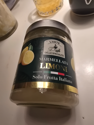 L'arte delle Specialità is an Italian brand known for producing high-quality food products, including marmalades and preserves. The specific product shown in the image is a lemon marmalade, or "Marmellata Limoni," featuring all-Italian fruit, which emphasizes its authentic flavor. Sourced and manufactured primarily in Italy, this brand embodies artisanal craftsmanship and traditional recipes, aimed at delivering quality and taste to consumers.