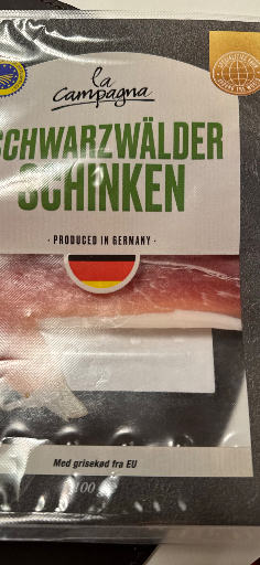 La Campagna's Schwarzwälder Schinken is a special type of cured ham originating from the Black Forest region of Germany. This particular product is produced in Germany, ensuring adherence to the traditional methods and quality standards associated with this classic delicacy. The brand, La Campagna, reflects an Italian influence, although specific details about the original company are not available. Given the German production indicated on the packaging, this product stands as a testament to both German culinary heritage and Italian branding, merging the best of both worlds in gourmet meat offerings.