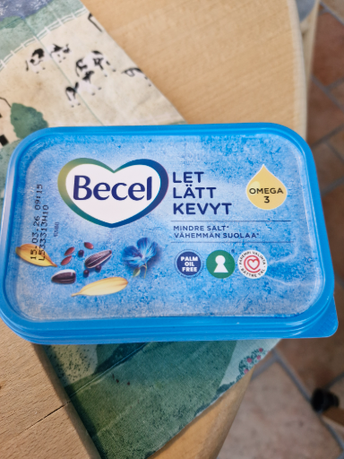 Becel is a brand of margarine developed by Unilever, originally established in the Netherlands. The product showcased is a lighter version of margarine, indicated by the term 'let lätt kevyty', which translates to 'light'. Becel is known for its focus on healthier fats, including omega-3 fatty acids, making it a popular choice among consumers looking for healthy alternatives to traditional butter. Unilever, the ultimate owner, operates globally and produces this product in multiple locations, ensuring widespread availability.