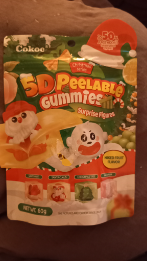 Cokoe is a brand that specializes in gummy candies, specifically featuring unique and playful shapes. The 5D Peelable Gummies are marketed as a holiday-themed treat, with flavors that cater to festive occasions. The packaging indicates a mixed fruit flavor profile, appealing to children and families. However, further details regarding the company's origins or the ultimate ownership are currently unavailable.