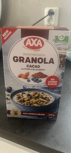 AXA is a Swedish brand known for its wide range of breakfast products, especially granola. The 'Granola Cacao Almond & Blueberry' variant caters to health-conscious consumers by being made with 62% whole grain and having no added sugar. The product is made in multiple countries, reflecting a global manufacturing strategy. General Mills, an American company, is the ultimate owner of the AXA brand, ensuring consistent quality and innovation in its product offerings.