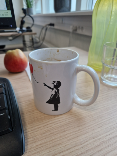 The 'Girl with Balloon' is one of Banksy's most iconic artworks, depicting a young girl reaching out toward a red, heart-shaped balloon. This design has been reproduced on various mugs by different manufacturers. For instance, the 'Flying Balloon Girl' mug is produced by Urban.ity, featuring a high-quality ceramic construction and a 325ml capacity. (charlesandmarie.de) Another example is the 'Girl with Balloon' mug by Könitz, made of bone china and available in a multicolored design. (koenitz.com) These mugs are typically manufactured in multiple countries, depending on the producer. The brand 'Banksy' originates from the United Kingdom, with the artist Banksy being the creator. As of 2026, there is no single ultimate owner company for the Banksy brand, as the artist operates independently. There are no known subsidiaries associated with the Banksy brand.