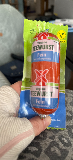 Rügenwalder Mühle's Vegane Teewurst Fein is a vegan alternative to traditional Teewurst, a popular German spreadable sausage. This product is crafted primarily from water, rapeseed oil, starch, shea butter, and pea protein isolate (2.4%), with additional ingredients like citrus fibers, table salt, psyllium husks, pea fibers, spices, and natural colorings derived from radish and carrot concentrates. The spread offers a creamy texture and a smoky flavor, making it suitable for various applications such as spreading on bread or crackers. Nutritionally, it provides 252 kcal per 100g, with 22g of fat (including 3.9g of saturated fat), 8.1g of carbohydrates (of which 0.6g are sugars), 2.8g of protein, and 2.1g of salt. The product is manufactured in Germany and is part of Rügenwalder Mühle's commitment to offering plant-based alternatives to traditional meat products.