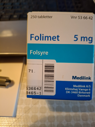 Folimet 5 mg is a pharmaceutical product prescribed for its folic acid content, primarily used to treat or prevent folic acid deficiency. Manufactured by Medilink A/S in Denmark, this product adheres to high pharmaceutical standards. The company, involved in the development of various health-related products, is based in Birkerød, Denmark. Medilink A/S oversees the production and quality control of Folimet, ensuring that it meets the necessary health and safety regulations for effective use.