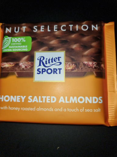 Ritter Sport, a leading German chocolate brand, is known for its square chocolate bars, including the Honey Salted Almonds variant. This product features honey roasted almonds and a touch of sea salt, providing a delightful blend of flavors in a confectionery format. The brand's commitment to sustainable cocoa sourcing further highlights its dedication to quality and responsibility in chocolate production. Ritter Sport operates internationally while maintaining its roots in Germany, where it was originally founded.