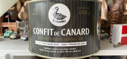 Confit de Canard, or duck confit, is a traditional French dish that consists of duck cooked in its own fat. It is often sold in cans or jars, preserving the rich flavors and tender texture of the duck. While this product is labeled in Danish, it corresponds to a classic French culinary offering. The manufacturing may occur in multiple locations depending on the brand, often sourcing high-quality duck from regions known for their poultry.
