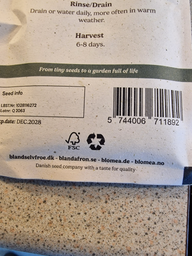 Bland selv frø is a Danish seed company that focuses on providing high-quality seeds for gardening. The product, a seed packet, offers various seeds suitable for home gardens, emphasizing the process from seeds to a flourishing garden. The packet includes guidance on planting and harvesting, ensuring users can effectively grow their plants. Production occurs in multiple countries, likely indicating a diverse sourcing of seed varieties.