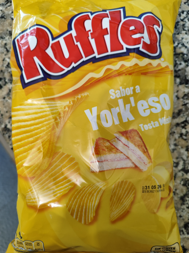 Ruffles is a brand of ridged potato chips that originated in the United States. Initially developed by Frito-Lay, Inc., the brand has grown to be recognized globally for its unique texture and flavors. The particular variant shown, Sabor a York'eso, reflects a unique flavor preference in some markets. PepsiCo, Inc., which owns Frito-Lay, is headquartered in the United States and oversees multiple international brands within the food sector, including Ruffles. The manufacturing of Ruffles chips occurs in various locations worldwide to meet demand, thus labeled as having multiple manufacturing countries.