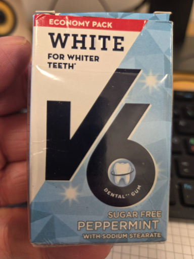 V6 is a brand of sugar-free peppermint gum designed for dental care, marketed as helping to whiten teeth. While specific origin information for the brand is not readily available, the product is likely manufactured in multiple countries, as is common with gum products. Comprehensive brand details and ownership structure could not be fully determined.