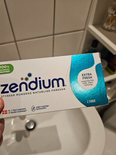Zendium is a brand of toothpaste founded in Denmark, known for its emphasis on strengthening the mouth's natural defenses. The product shown is the 'Extra Fresh' variant, which promises long-lasting freshness. Initially developed by Zendium A/S, the brand was acquired by Colgate-Palmolive Company, a renowned global leader in oral care products. Colgate-Palmolive is headquartered in the United States and owns several other major brands in personal care and household categories.
