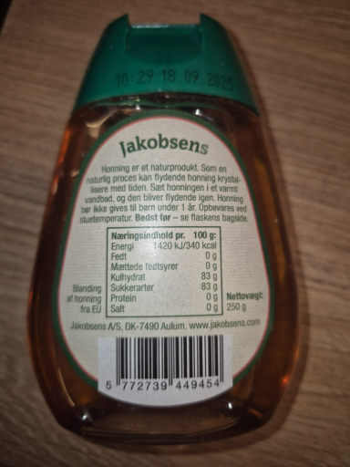 Jakobsens is a well-known Danish brand specializing in honey products. The flydende honning (liquid honey) is a natural product made through a careful process to maintain its quality. The brand emphasizes the pure and natural essence of honey, and their products are popular in Denmark and beyond. Jakobsens A/S, the original company behind this brand, has established a reputation for quality and sustainability in honey production, with operations primarily based in Denmark.