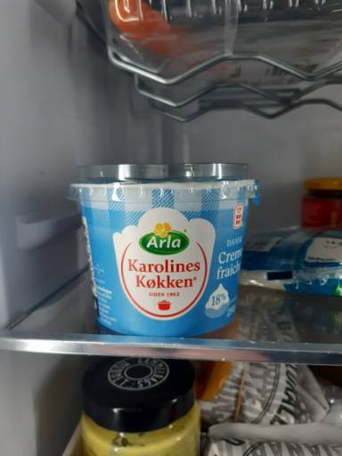 Arla is a well-known brand in the dairy industry, particularly in Scandinavia, with a history dating back to 1881. The product in this image is Karolines Køkken Crema fraiche, a popular cream product in Denmark. Arla Foods prides itself on its commitment to quality and sustainability, making it a trusted name for consumers looking for dairy products. The company is headquartered in Denmark and operates multiple production facilities across the region.