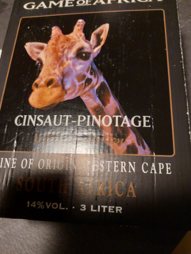 The product is a wine called 'Cinsaut-Pinotage' under the brand 'Game of Africa,' sourced from the Western Cape region of South Africa. The wine features a giraffe on its packaging, indicating its thematic branding inspired by African wildlife. While specific company information is not available, the product is primarily made in South Africa, emphasizing the region's winemaking heritage.