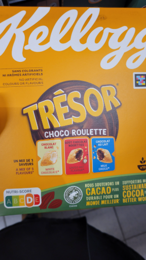 Kellogg's Trésor Choco Roulette is a breakfast cereal consisting of crispy grain pillows filled with three different chocolate flavors: milk chocolate, white chocolate, and hazelnut chocolate. The product is manufactured in multiple countries, including the Netherlands, where Kellogg's Europe operates a production facility. The barcode 5059319015859 is associated with this product, indicating its availability in various markets. Kellogg's, the brand behind this product, originated in the United States and is owned by the Kellogg Company, a leading global food manufacturer headquartered in Battle Creek, Michigan. The company specializes in breakfast cereals and convenience foods, with a presence in numerous countries worldwide.