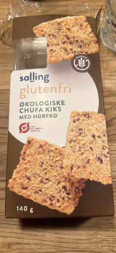 Salling glutenfri is a Danish brand specializing in gluten-free products, developed by Salling Group A/S to meet the demand for gluten-free foods. The brand offers a variety of gluten-free items, including the Økologiske Chufa kiks med Hørfrø, which are organic, gluten-free crackers made with chufa flour and flax seeds. These crackers are produced primarily in Denmark, with some production in other locations. Salling Group A/S, headquartered in Denmark, is the ultimate owner of the brand and operates several supermarket chains, including Føtex and Bilka, where these products are available.