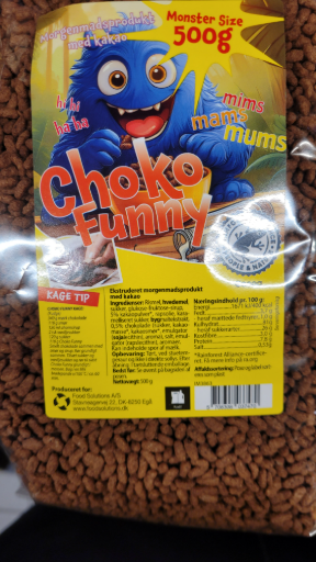 Choko Funny is a breakfast cereal designed for children, featuring a playful monster theme that appeals to younger audiences. The product is manufactured by A/S Dagrofa, a company based in Denmark, which has a history of providing various food products. The ultimate owner of the brand, Bertel O. Steen A/S, has a diverse portfolio that includes consumer goods and automotive interests. The cereal is produced in multiple countries to meet demand, ensuring wide distribution.