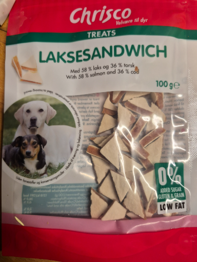 Chrisco Treats Laksesandwich is a specialized dog treat designed for pet owners looking for healthy snack options for their furry friends. Made primarily in Denmark, this product features 58% salmon and 36% cod, ensuring a high-quality protein source. The brand, Chrisco, is well-regarded for its commitment to providing nutritious and low-fat options, reflecting a growing trend in pet care. Their products are easily recognizable by their distinct packaging that appeals to dog owners looking for healthy and tasty treats.