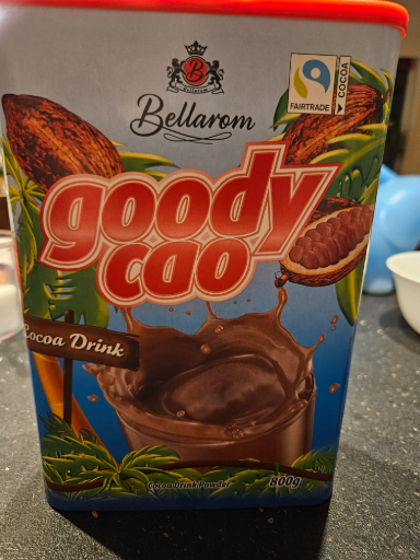 Goody Cao is a chocolate-flavored milkshake mix produced under the Bellarom brand, which is owned by Lidl Stiftung & Co. KG, a German multinational discount supermarket chain. The product is manufactured in multiple countries, including Germany, Poland, and other European nations. Goody Cao is available in various sizes, including 500g and 800g packages. The product is certified vegan and carries the Rainforest Alliance certification, indicating that it meets environmental and social standards in its production. The ingredients include sugar, dextrose, 20% cocoa powder, emulsifier (sunflower lecithin), salt, and added vitamins C, E, B6, niacin, thiamin, pantothenic acid, and folic acid. The product is free from palm oil, making it suitable for those concerned about environmental impact. Nutritionally, Goody Cao provides 370 kcal per 100g, with high sugar content, moderate fat, and low salt, aligning with its classification as an ultra-processed food.