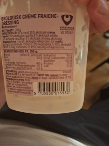 Økologisk Creme Fraiche-Dressing is an organic cream-fraiche-based dressing, typically used as a flavor enhancer for salads and various dishes. The product packaging indicates that it is pasteurized and includes natural ingredients. It is likely produced in multiple locations to meet the demand for organic food products, especially in Denmark, where organic farming is prevalent. The brand name, Varefakta, signifies quality assurance in Danish food products, though specific company ownership details are not disclosed in the visible information.