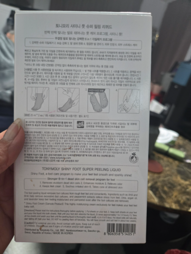 TONYMOLY Shiny Foot Super Peeling Liquid is a foot care treatment designed to exfoliate and remove dead skin cells, leaving feet soft and smooth. Manufactured in South Korea by TONYMOLY Co., Ltd., a company renowned for its innovative skincare products, this treatment utilizes a blend of AHA and BHA to gently exfoliate the skin. The product is infused with fruit extracts, including peppermint, grape, orange, apple, and lemon, as well as argan oil and lavender extract, to moisturize and soothe the skin. The treatment involves wearing plastic booties filled with the peeling liquid for approximately 1 to 1.5 hours, after which the dead skin begins to peel away naturally over the course of several days, resulting in baby-soft feet. (whatsinmyjar.com)