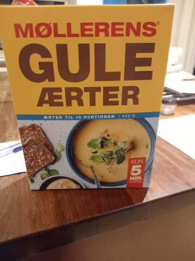MØLLERENS GULE ÆRTER is a food product consisting of yellow peas, packaged for easy preparation. The brand MØLLERENS originated in Denmark and is owned by Møllerens A/S, a company recognized for its wide range of food offerings, particularly in the legumes and grain market. The packaging indicates the product serves 10 portions and can be prepared in just 5 minutes, highlighting its convenience for consumers.
