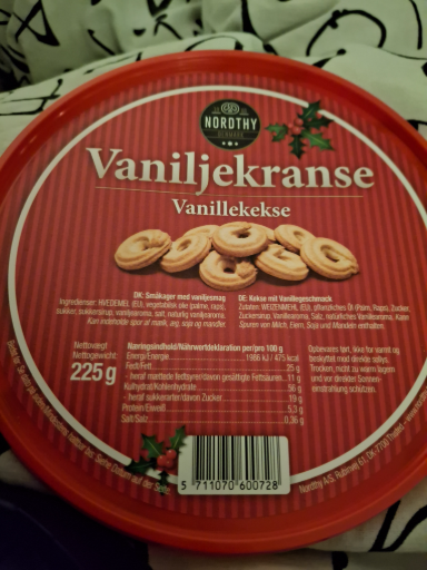 Nordthy Vaniljekranse are traditional Danish butter cookies, characterized by their delicate vanilla flavor and crisp texture. These cookies are produced by Nordthy A/S, a Danish company renowned for its confectionery products. Manufactured in Denmark, Nordthy A/S emphasizes the use of high-quality ingredients and traditional baking methods in their products. The company is headquartered in Thisted, Denmark, and operates under the same name, Nordthy A/S. As of 2026, Nordthy A/S remains an independent company, with no known subsidiaries or changes in ownership.